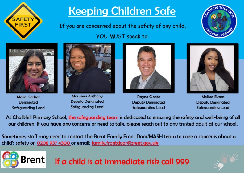 For any matters concerning safeguarding outside school hours or in the school holidays, please email the school’s DSL on safeguarding@chalkhill.brent.sch.uk